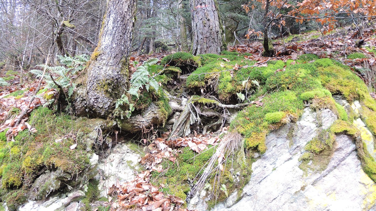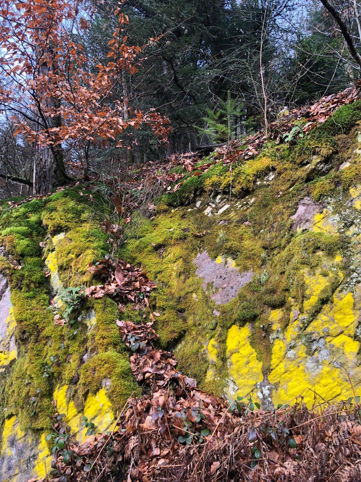 Erstaunlich, wie die Natur auch hier wieder harmoniert zum Beispiel mit leuchteten Moos an Baumrinden, Ästen und Felsstücken in üppigen Grünvariationen und Arten. Sprichwörtlich ist auch in diesem Tal ein besonderes Kraut – äh – Blütenpflanze gewachsen. Man kann es von ca. Juli bis September bestaunen, das einzige was nicht der Schönheit entspricht ist der Name: Teufelsabbiss! Das lila – himmelblaue Gewächs gehört zur Familie Geißblatt und ist im Schnitt ca 40 cm hoch – erreicht aber bis zu 80 cm. Als Speicher- und Überdauerrungsorgan dient ein Rhizom, das unterhalb abfault und wie abgebissen wirkt und 50 cm in die Tiefe reicht, daher der unverdient hässliche Name. (siehe Foto und im Sommer in Natura )
